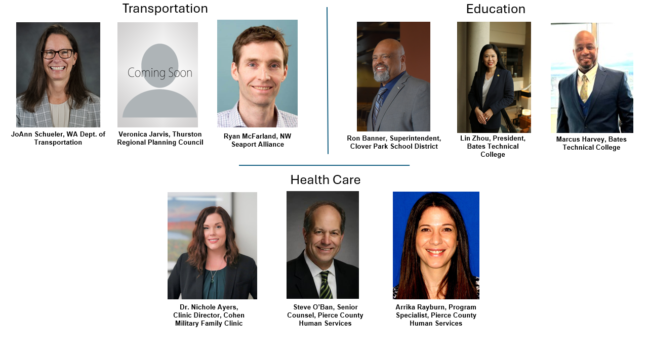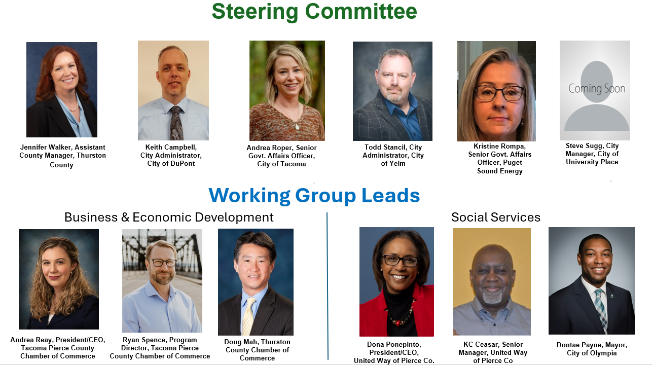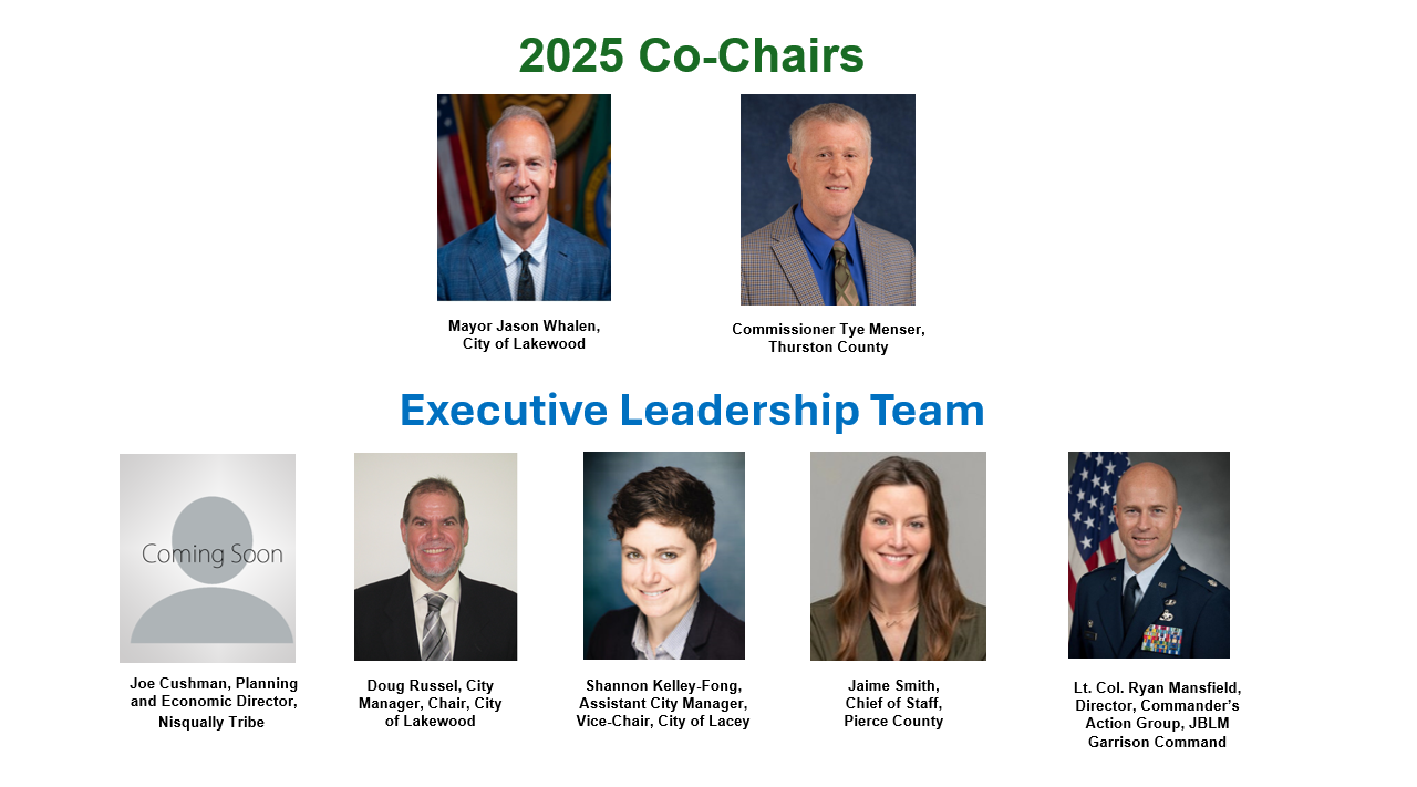 The South Sound Military and Communities Partnership (SSMCP) is led by its Executive Leadership Team (ELT), which provides strategic guidance on behalf of member organizations. While multiple representatives may participate from a single organization, each organization holds one vote to ensure equal representation in decision-making.